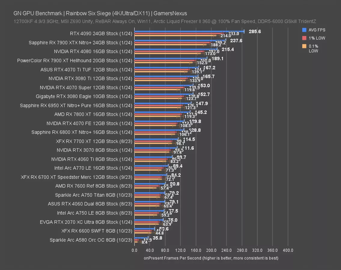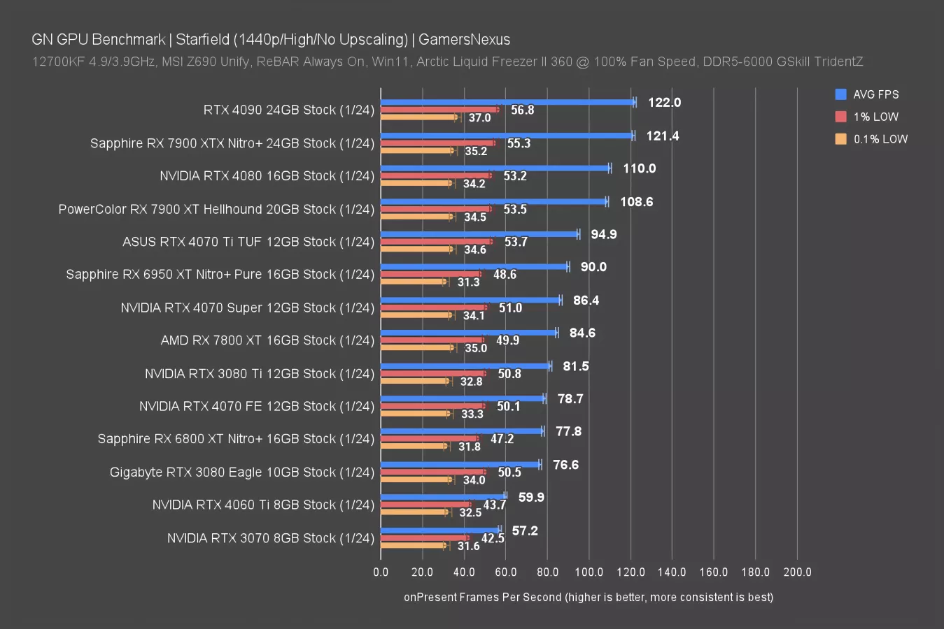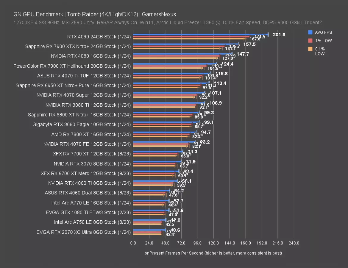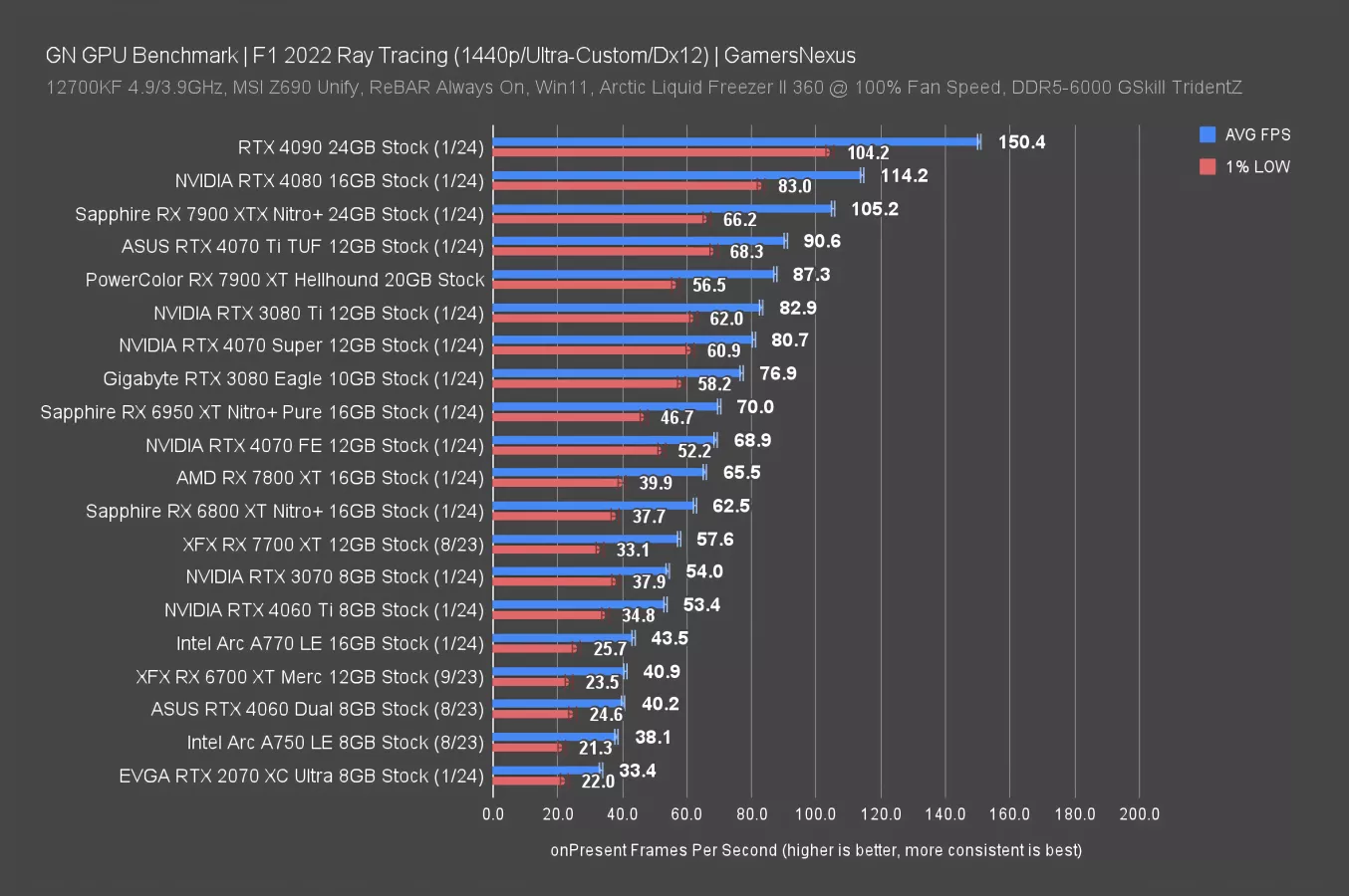 At 1440p, the 4090 illustrates that we have plenty of room to measure the 70-class cards and establishes a large gap between itself and the next card down, which is the 7900 XTX.