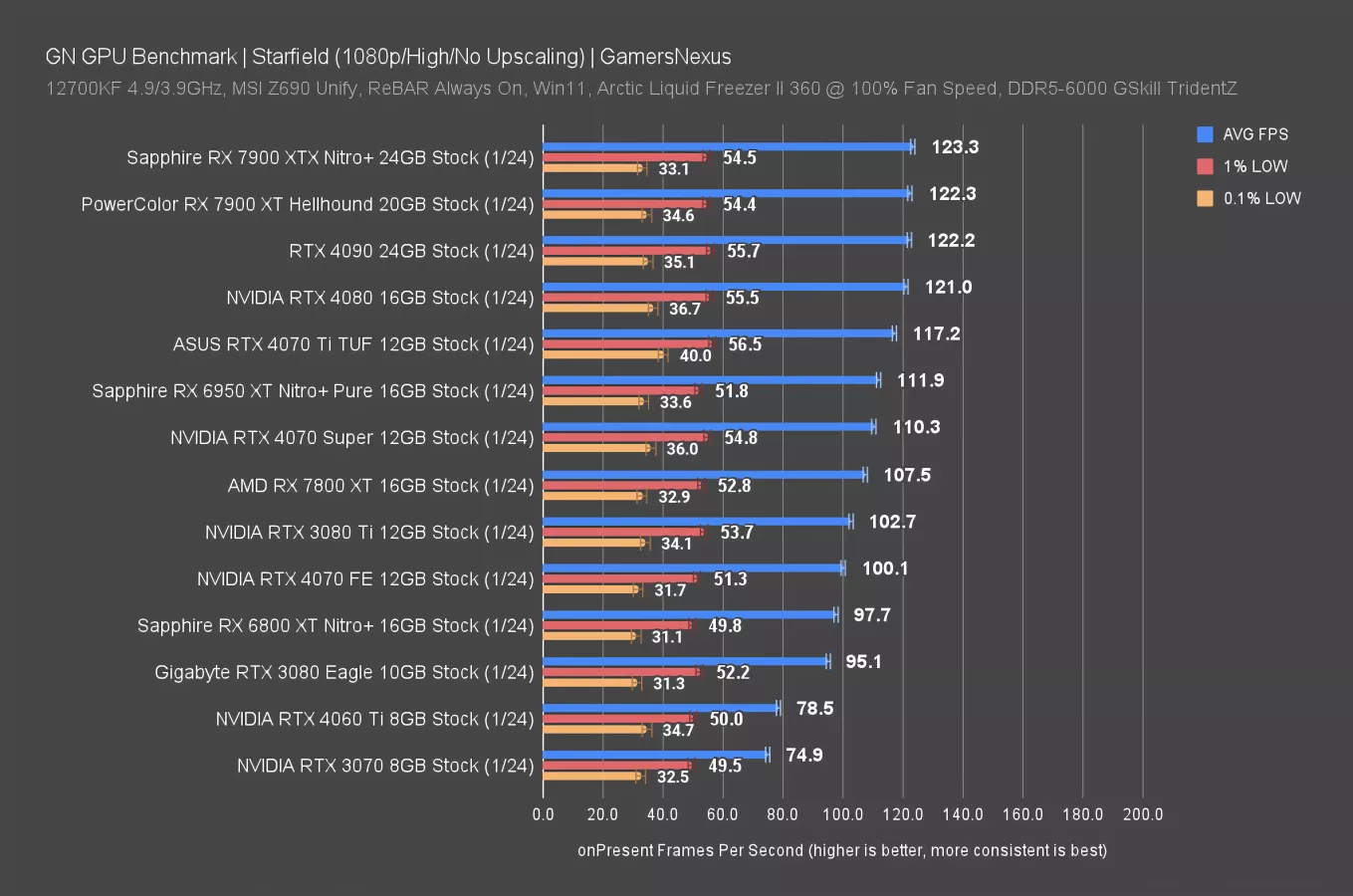 The RX 7800 XT and 6800 XT encroach on the 4070 Super, with the 6800 XT basically equating it and providing an indistinguishable experience, while the 7900 XT again leads. This game is fairly heavy on all these cards, helping illustrate clean scaling from one to the next. The 4080 is about 41% ahead of the 4070 Super, so we’re looking forward to seeing how close to the 4090 the 4080 Super will be to each other.