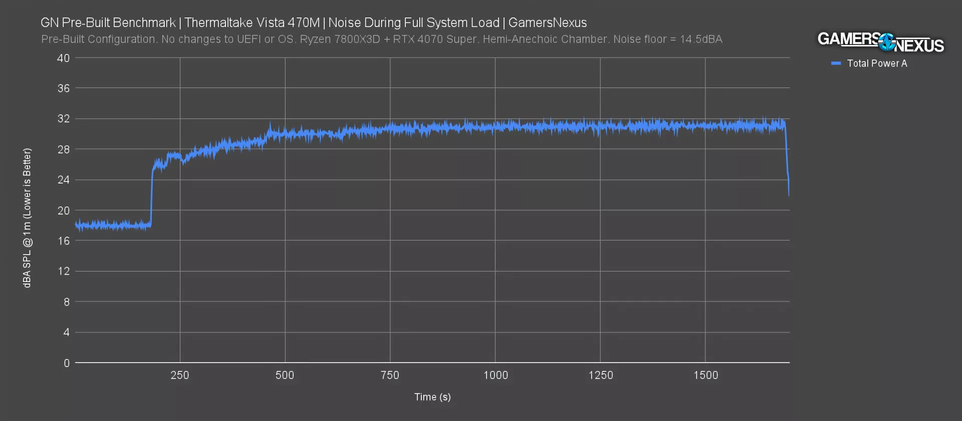 The image above is a plot of dBA over time during the same full system load. The average noise level during idle was 18 dBA. Noise levels during steady-state reached 31.1 dBA. What we’re really looking at here is the ramp: Thermaltake’s system ramped to full noise level over a period of about 10 minutes, which is great. That means Thermaltake isn’t unnecessarily rapidly ramping and de-ramping the fans (other than that initial spike) and is utilizing time to slowly increase the speeds. This would help control noise levels during spikier workloads.