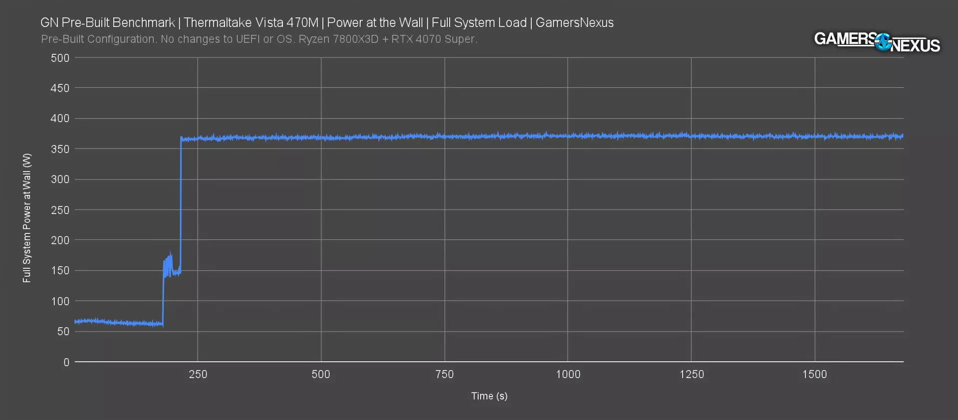 Full system power measured at the wall is up first in our charts. This is captured while the system is running a full CPU plus GPU load with Blender and Port Royal on loop. System power consumption idles at around 60-70W and then climbs to roughly 150W during the brief CPU-only load portion, then jumps over 360W when the GPU joins in. It’s stable overall, and during our steady-state period, results in a 370W average. With an 850W PSU, Thermaltake has gone slightly overkill on the power supply, but not in a bad way. Most power supplies are at peak efficiency somewhere in the 40% to 60% range of utilization for capacity, although it depends on the power supply. 850W gives just enough headroom for an upgrade without increasing cost unnecessarily while also staying within a reasonable efficiency range.