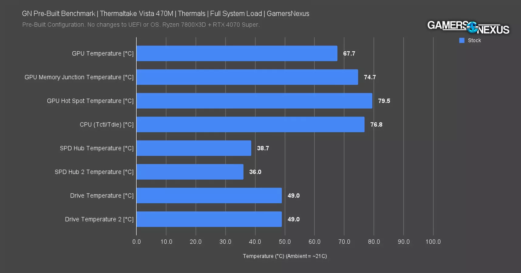 Next is a simple bar chart of all thermals at steady-state in the same workload. The GPU has plenty of access to fresh air, keeping itself to 68 degrees Celsius on the core, 75 degrees on the memory, and 80 degrees hotspot. This is all completely fine.