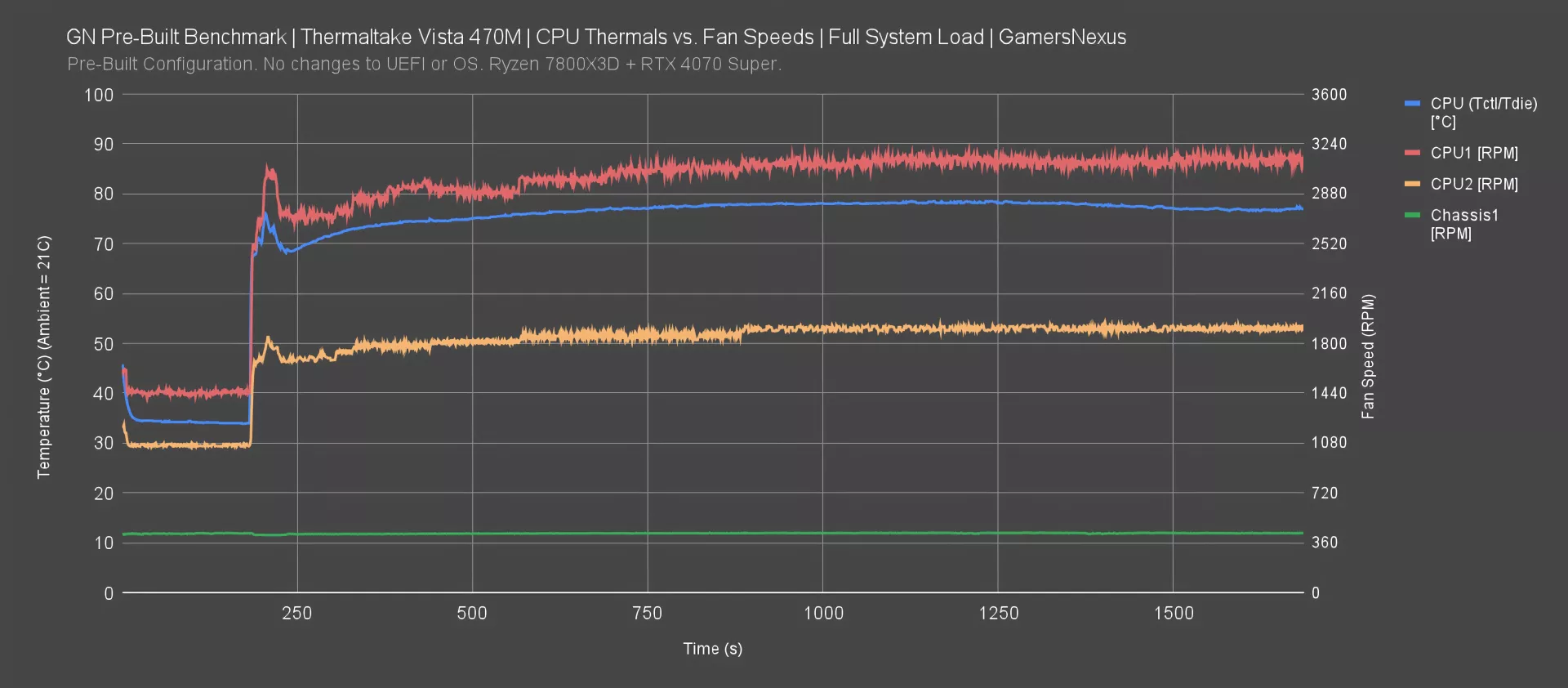 The cooler fans topped out at 1908 RPM AVG, but the chassis fans only reached 429 RPM AVG. This is so low that we doubt they're contributing much at all to the overall cooling. The system doesn’t really need them to be going faster, but this points to them being improperly configured.