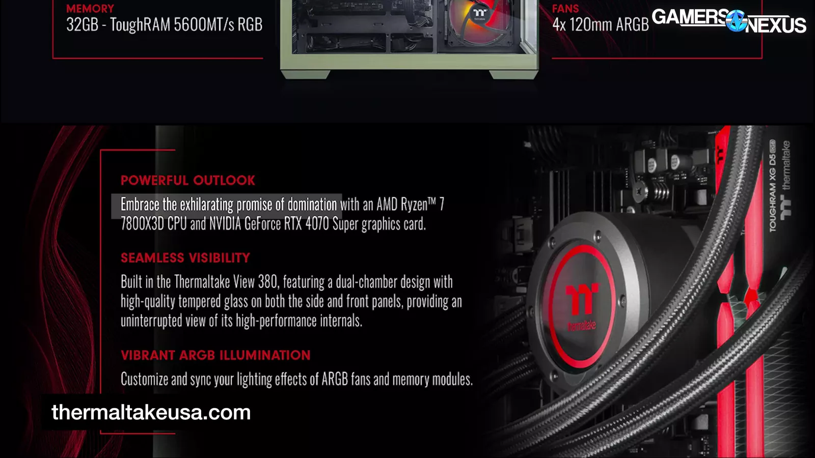 “Embrace the exhilarating promise of domination,” Thermaltake says in surprisingly tame marketing cringe, and that’s about it. The rest of the language is pretty normal: Talk of completing a battle station, edge-to-edge glass, the usual MDF-fueled NVIDIA and AMD branding, and talk of the components. Shockingly, the only thing on this page that was worth making fun of was the exhilarating promise of domination. Once again, for a pre-built, this is already one of the more professional listings.