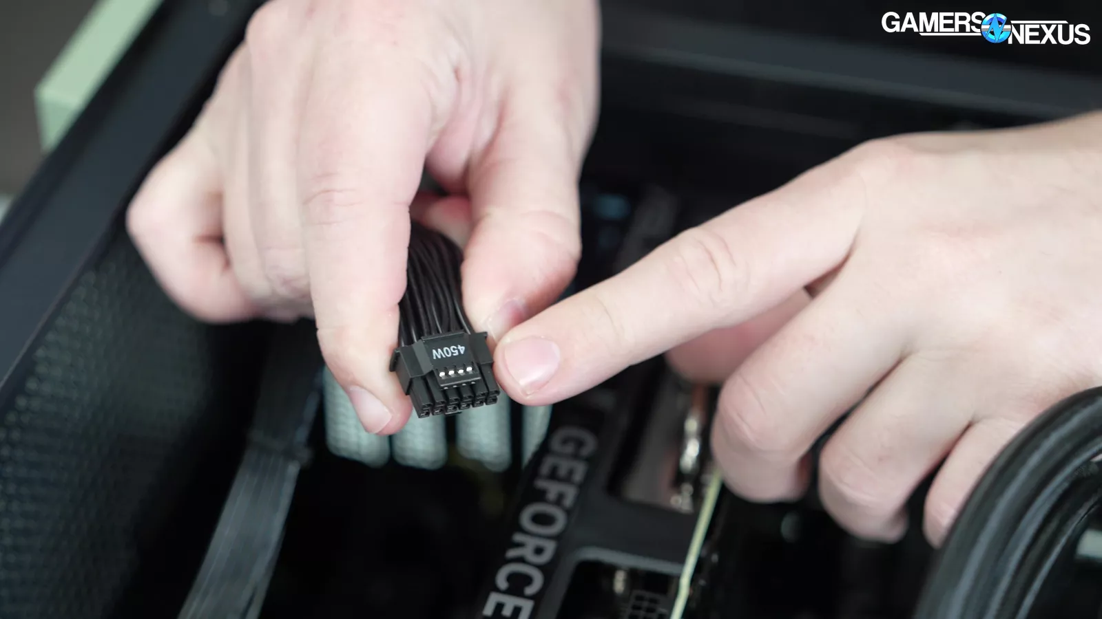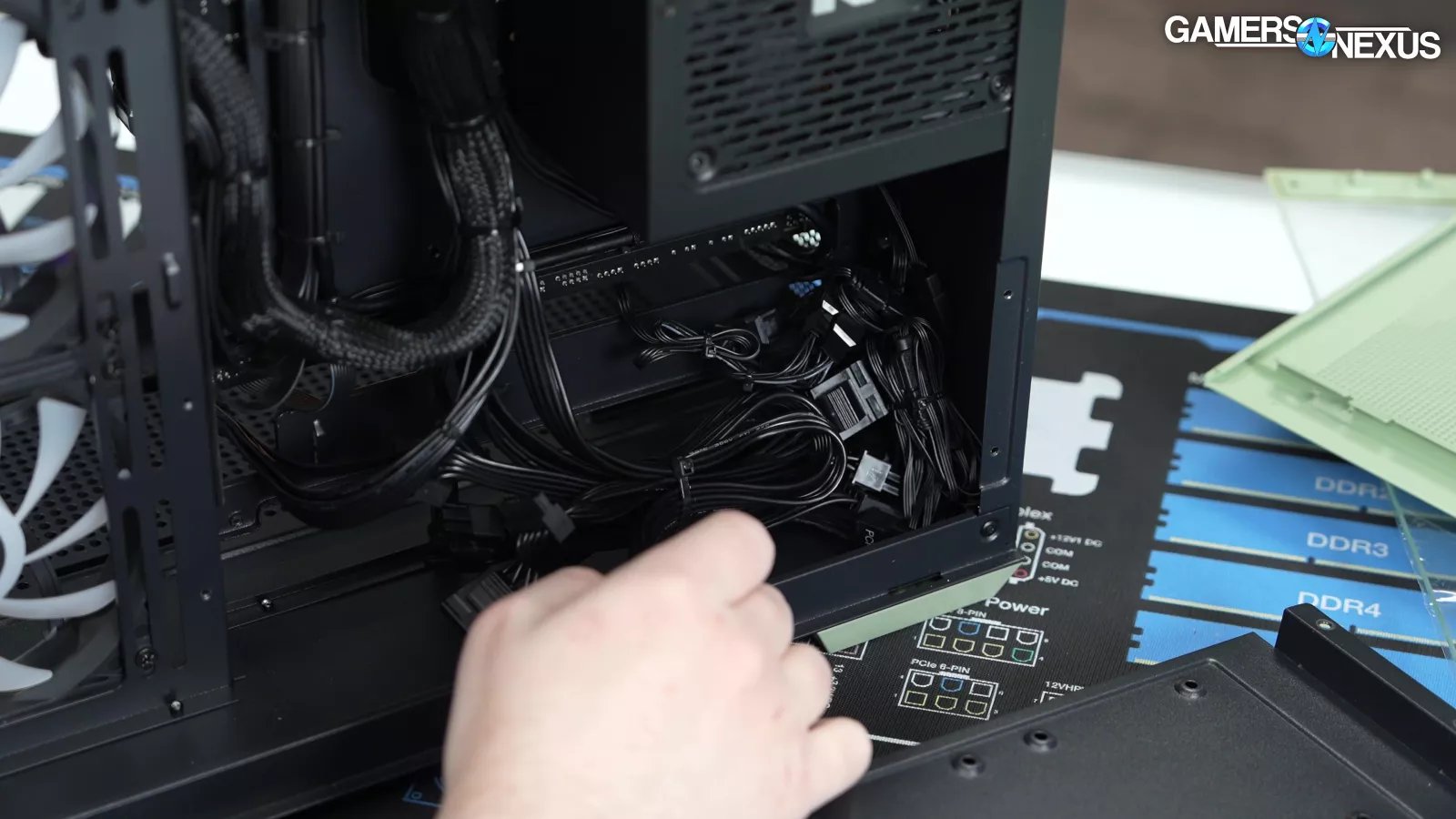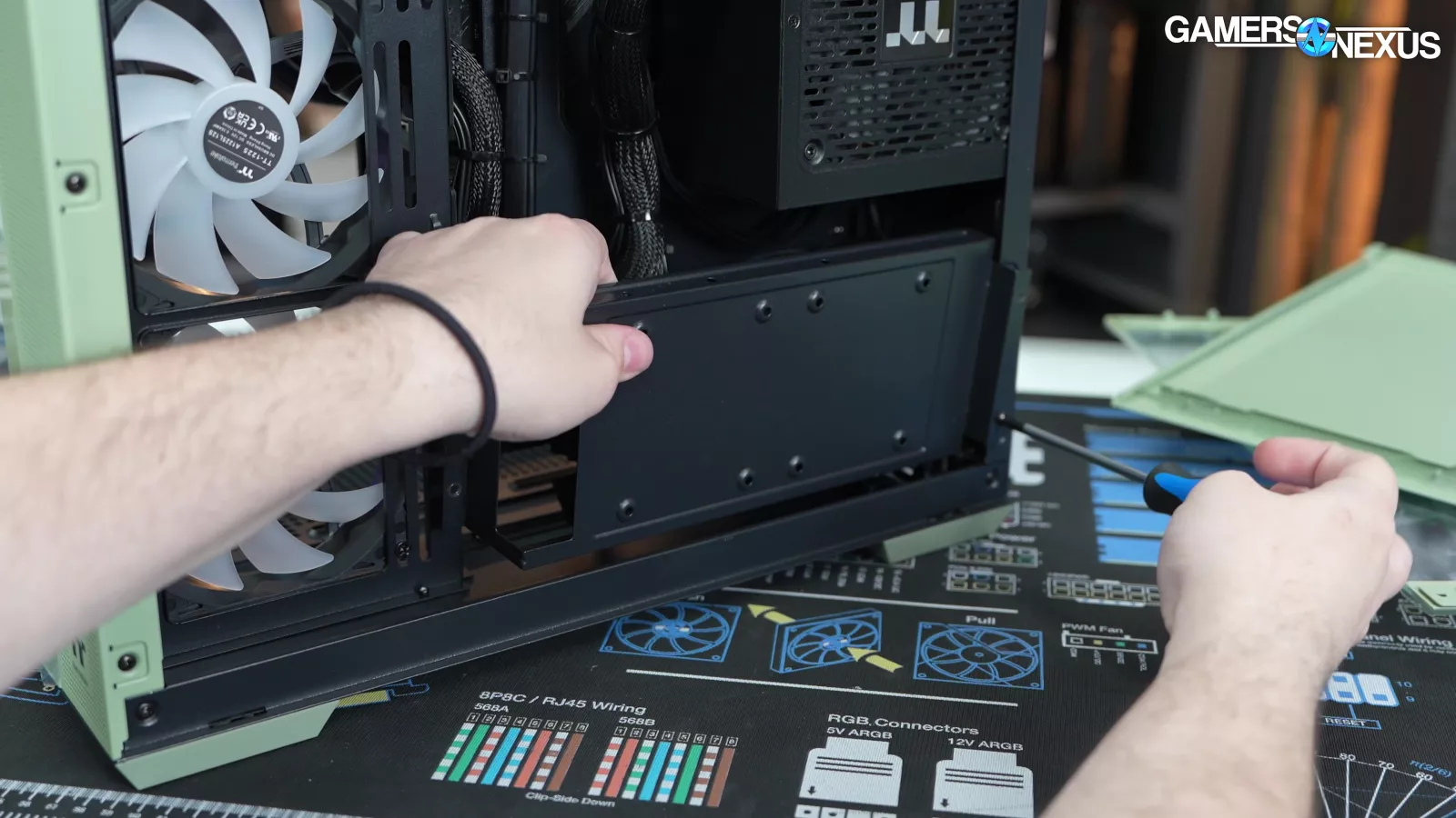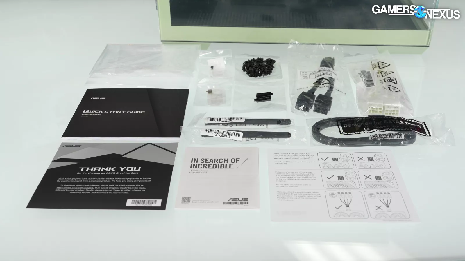 The bag of accessories inside the case has the case manual, SATA cables, WiFi antennae, extra screws, and, curiously, two 12VHPWR adapters. One of them is the official NVIDIA adapter that probably came with the 4070 Super and the other is a mismatched-white that just looks bad. Nothing in the build is white themed, so we assume this was an accidental inclusion. Including the native NVIDIA adapter is good though, as there are a lot of reasons a user may want it in the future. Keeping the card’s accessories with the card is the right move and we’re happy to see it. Some SIs just toss the extras, which could minimally pose issues for second-hand resale when done with the system.