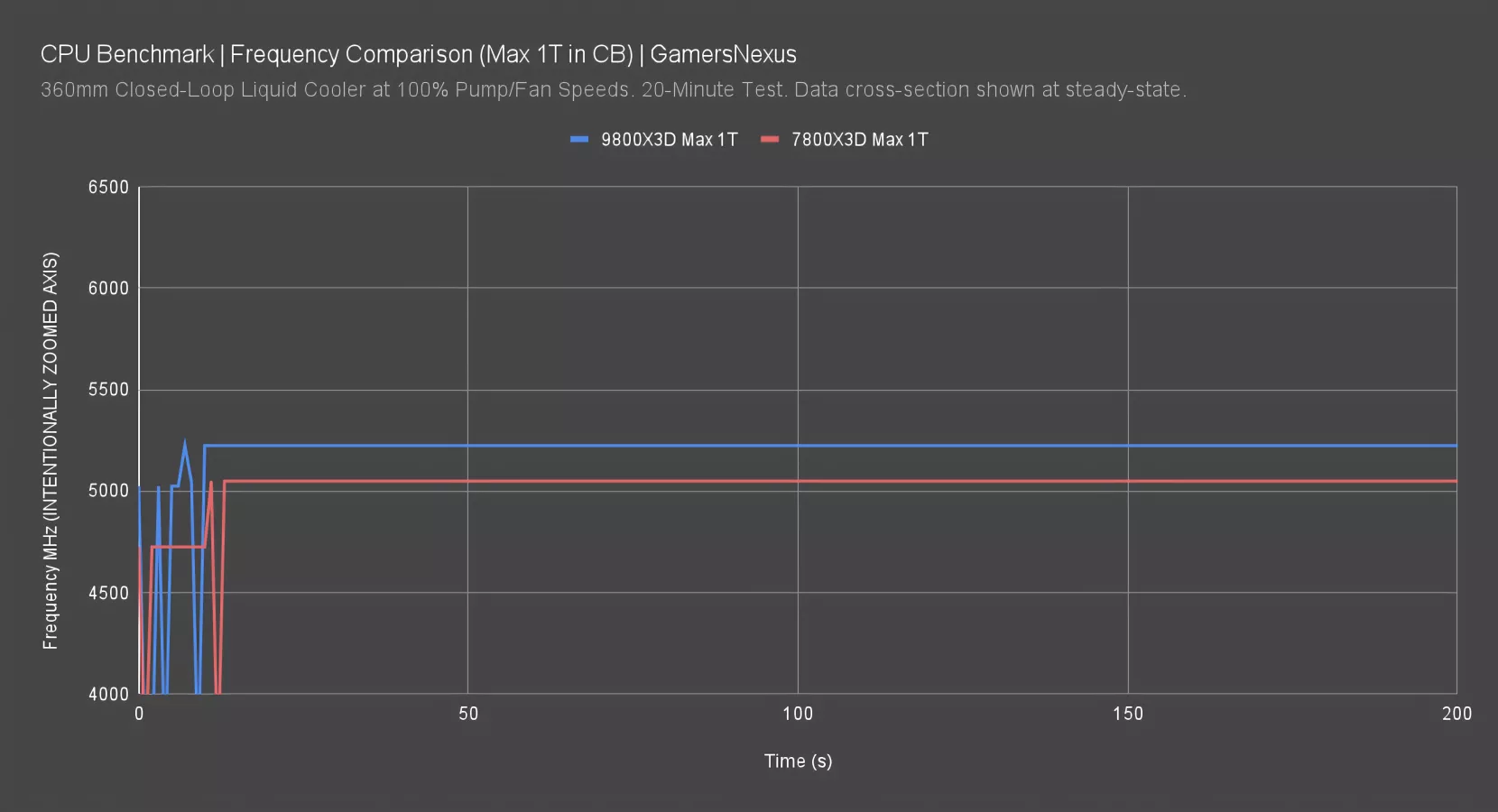 The 7800X3D averaged between 4800 and 4890 MHz during the original review cycle for this same test. It’s significantly lower and less fixed, shown by the line’s variability.