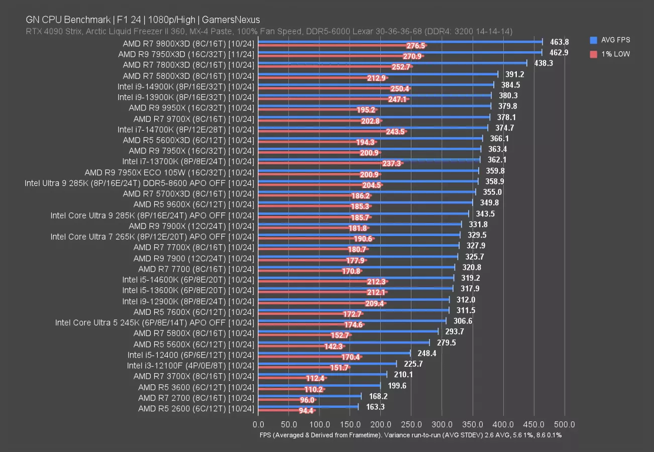 F1 24 is another of the games with a lower boost over the 7800X3D. The 9800X3D ran at 464 FPS AVG here, a 5.8% improvement on the 438 FPS result of the 7800X3D. The 14900K ran at 385 FPS AVG, so that’s about a 21% uplift for the 9800X3D. The 285K was massively regressive in this game and was down at 344 FPS, giving the 9800X3D a 35% advantage.