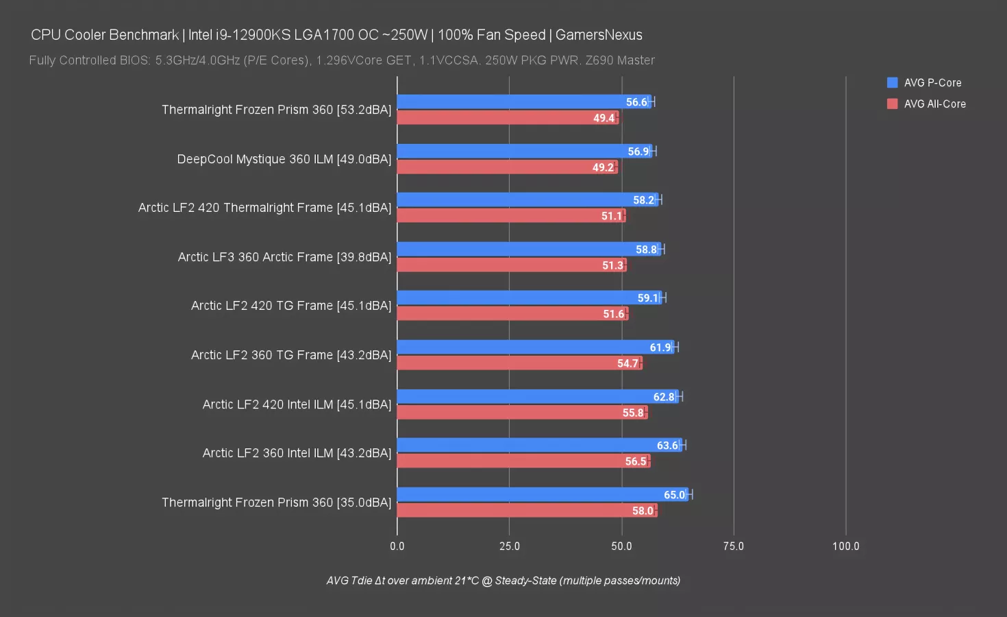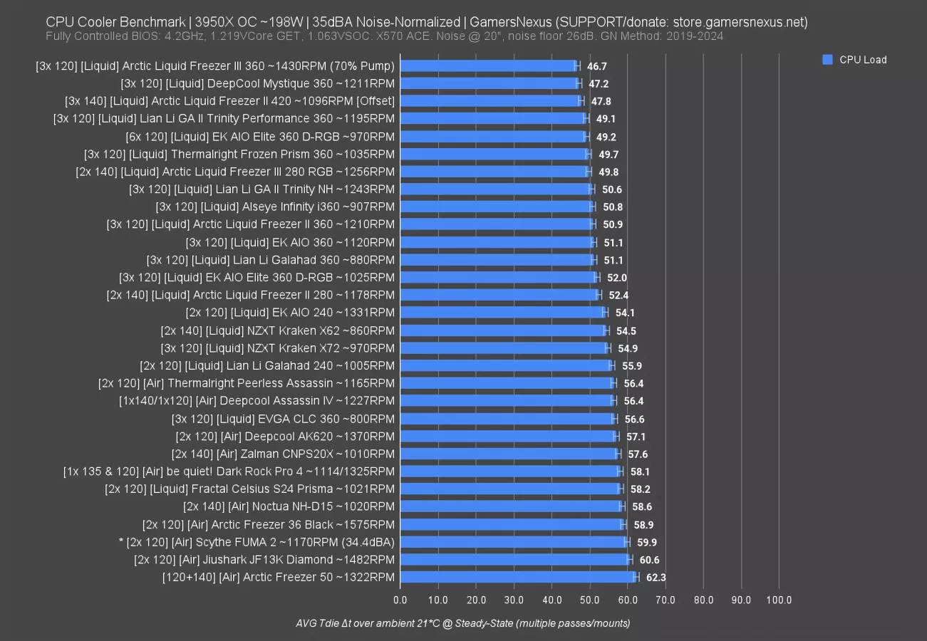 Anyway, the Frozen Prism is about equal to the Liquid Freezer III when it’s in a reduced 280mm size. The closest air cooler on this chart is Thermalright’s own Peerless Assassin (watch our review) at 56 degrees, pushed below all the liquid coolers.
