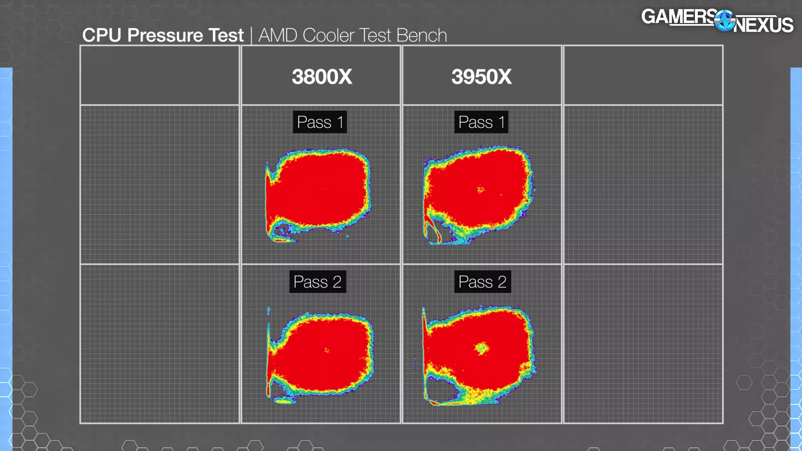 We’ll start on the AMD platform. Here, we observed super high pressure almost circularly around the middle of the IHS. This appeared on both CPUs we tested. That high central pressure is what we recently found to produce the best performance when we did our Scythe cold plate engineering deep-dive video.