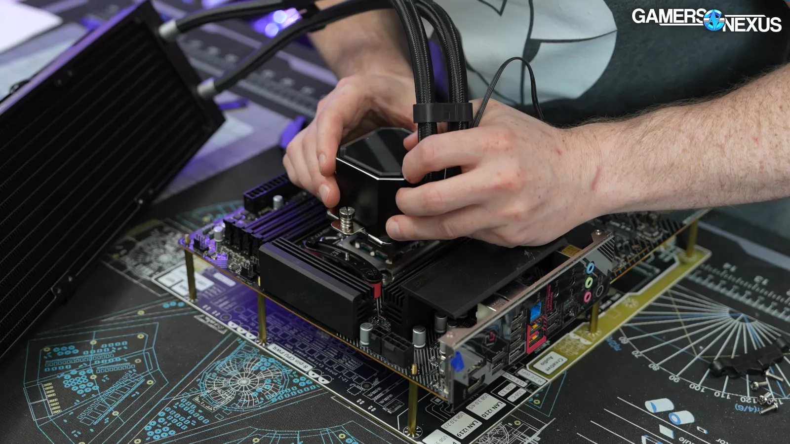 From here, install the mounting brackets, ensuring that they’re laid out in the correct position for your CPU (We used the middle position for LGA 1700), and secure them with 4 nuts.