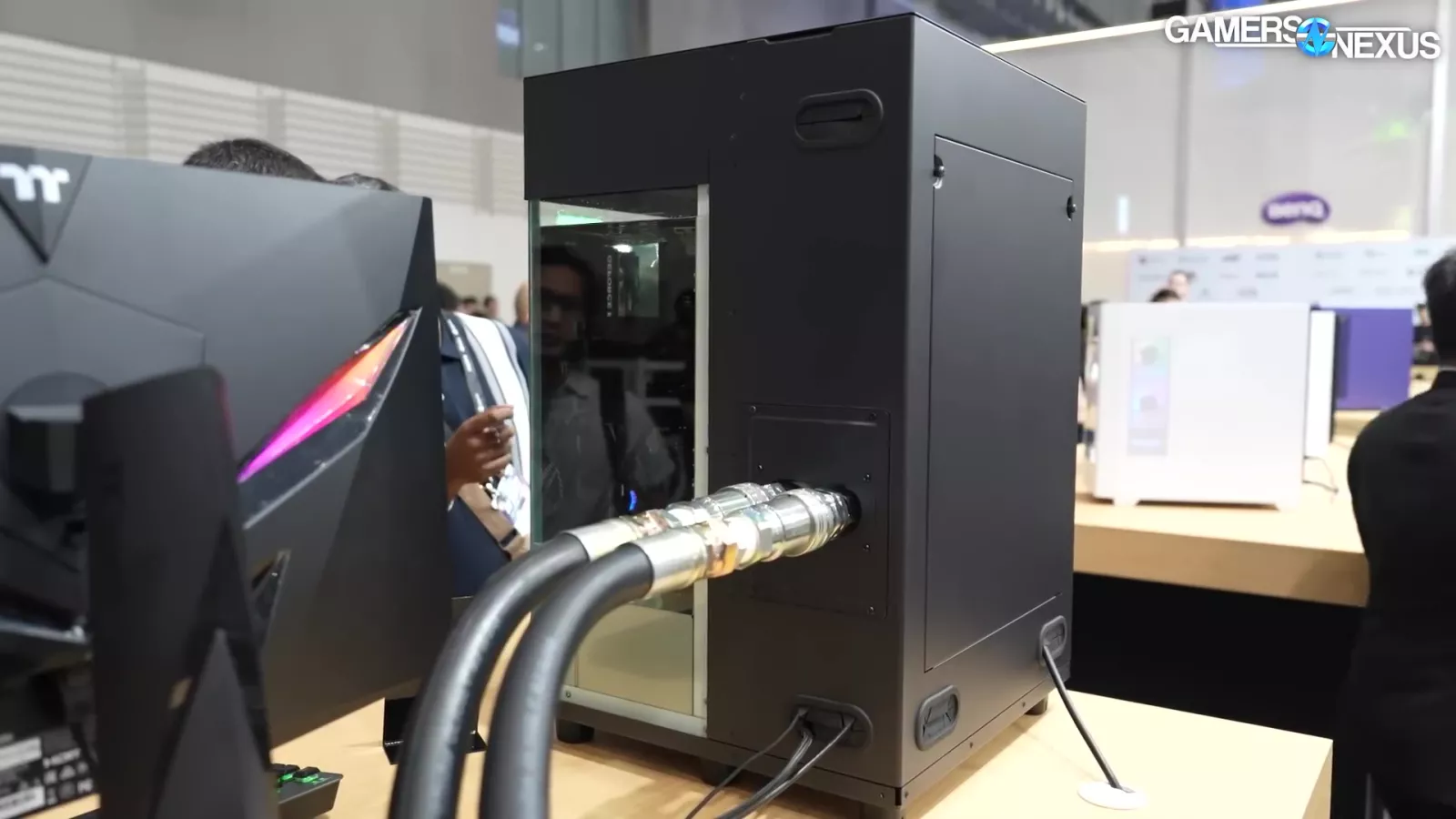 The liquid is piped through 2 gigantic pipes, which Thermaltake tells us is rated for 20 bar. That’s insane. It then connects to a massive 4-radiator system. Overall, it’s a showcase for an enterprise solution, but it’s super cool.
