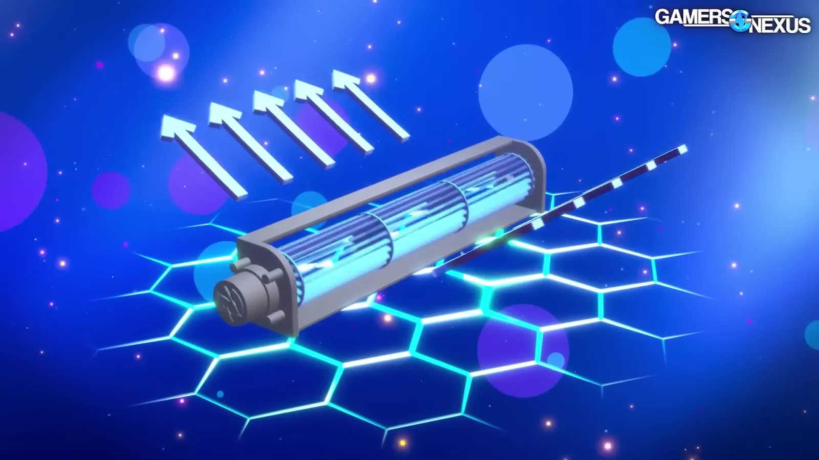 Crossflow fans are separated by disks. These disks cut across and create blocks of fan blades. The fan blades run along the whole length of the fan with a very slight angle to them. The point of a crossflow design is that air can enter tangentially to the axis of the fan and then it gets spat out, effectively, perpendicularly. This is a less directed flow. Axial fan blades slice through the air and push it. There’s a bit of a buffering effect from that. The downside is that there’s less targeted flow. The upside is that it’s a more laminar flow and it’s also sort of a gentler flow across a larger area.